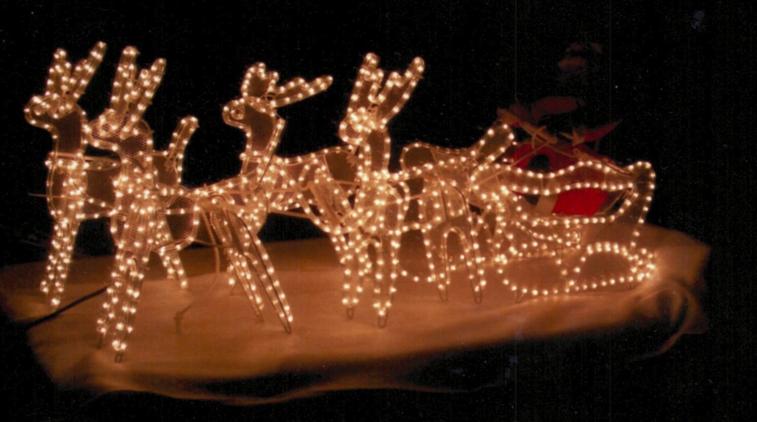 Primeiro foi um trenó puxado por renas. Então arrancamos o Papai Noel que estava pendurado em uma escada subindo por uma das janelas e o colocamos sentado no trenó. Lindo. Mas ninguém via o trenó porque, claro, moramos num terraço e só os apartamentos dos prédios mais altos conseguiam admirar nossa decoração. Então no ano seguinte grudamos umas luzes numa rede de proteção de um lado do apartamento. Luzes azuis. Mas faltava o outro lado. Compramos mais luzes e fizemos um “ninho” para o trenó com o Papai Noel.