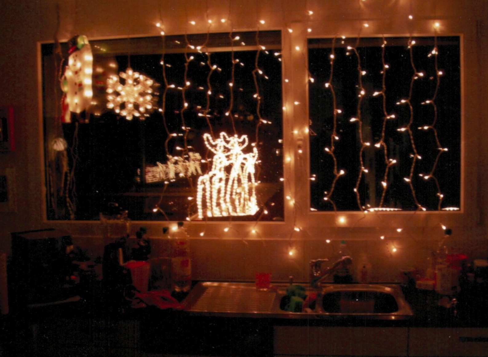 Als erstes kam ein leerer Schneeschlitten, gezogen von Rentieren. Dann haben wir einen Weihnachtsmann aus einer Strickleiter befreit (der Typ Weihnachtsmann, der aussen an der Wand hängt und über die Strickleiter in die obere Wohnung steigt) und in den leeren Schlitten gesetzt. Schön anzusehen. Nur sah das niemand, klar, wohnen wir doch zuoberst und nur die Häuser weiter oben am Hang konnten unsere Dekoration bestaunen. So haben wir dann im darauffolgenden Jahr eine Leuchtkette auf der hinteren Seite unserer Wohnung über die halbe Länge der Wohnung jeweils vom Dach bis hin zum Geländer gezogen. Blaue Lichter. Es fehlte noch die andere Seite. Wir haben noch mehr Lichter gekauft und um den Weihnachtsschlitten weitere Figuren angehäuft.